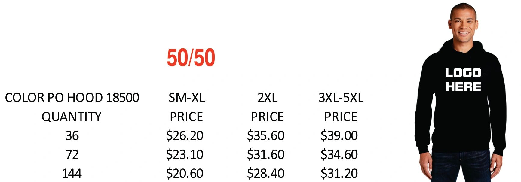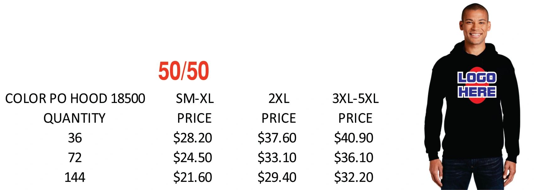 Below are our quick pricing charts for the color hoody with various print configurations that include white as one of the print colors. Pricing based on Gildan brand hoody. Designs that do not include white may be priced slightly higher to account for white under base. Multicolor prints can be either back or front. Color hoodys can be mixed with other color or white white items like short sleeve tees to get same volume pricing. Contact us for availability and pricing on tall sizes sizes as well as higher volume pricing.